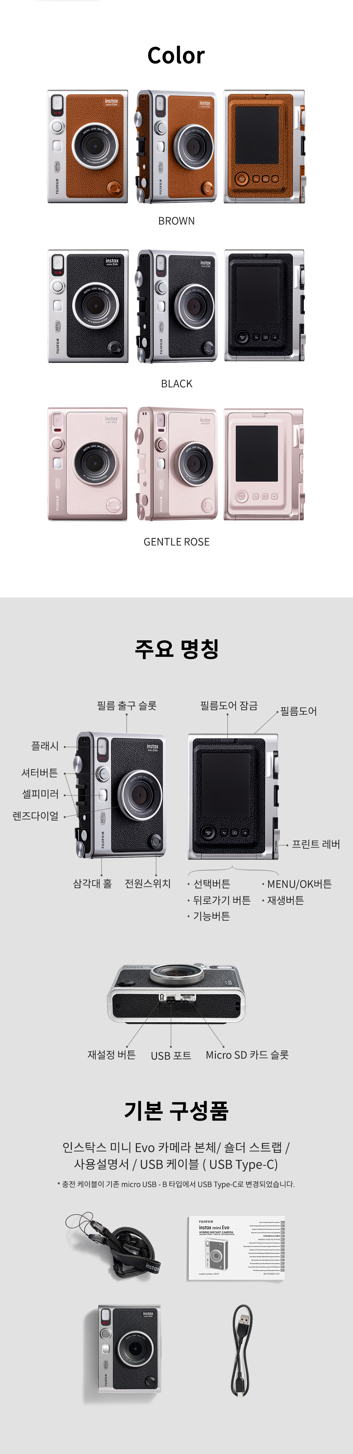 품명 및 모델명 | 인스탁스 미니 에보(mini Evo) [구성: 인스탁스 미니 에보 카메라 본체, 숄더 스트랩, 사용설명서, USB 케이블(micro USB-C] |