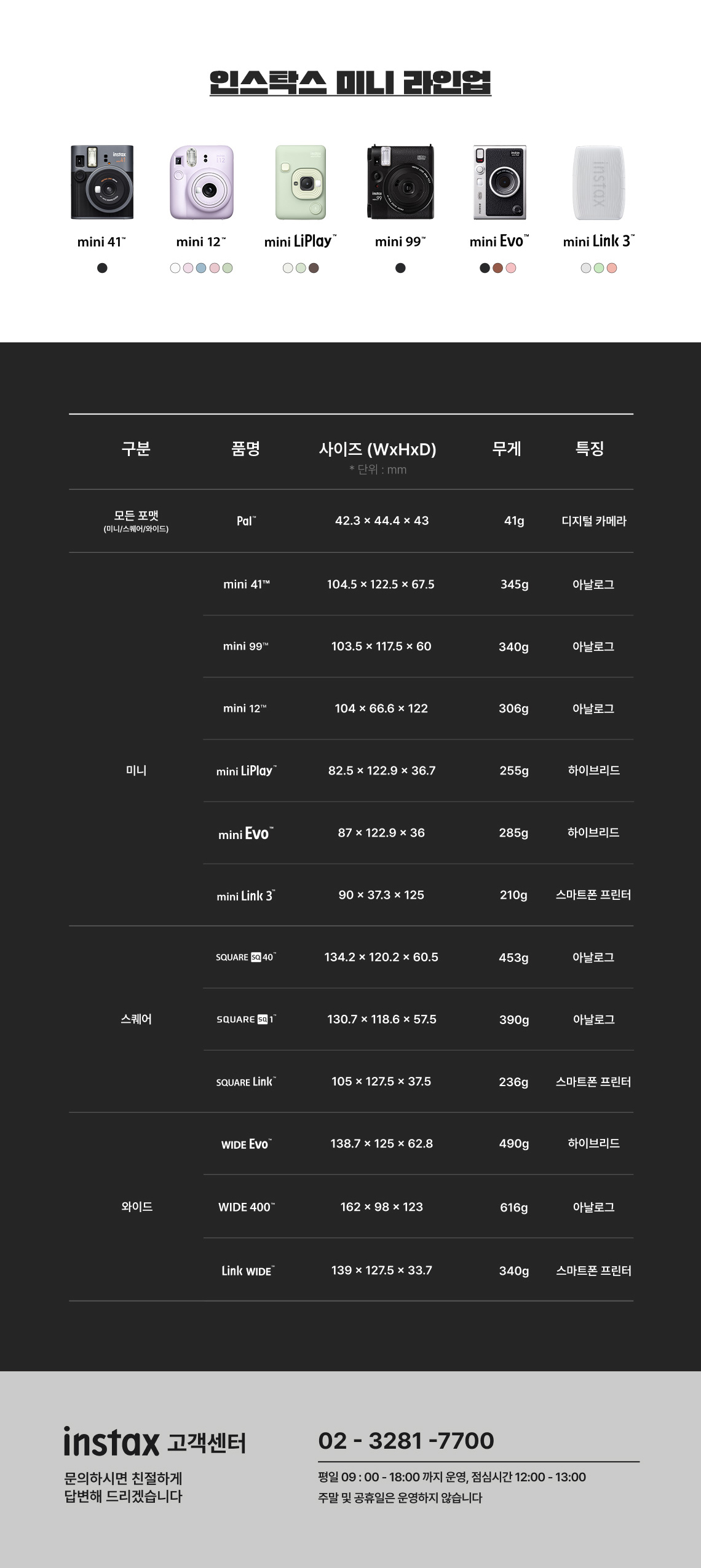 크기,무게 | 본체 : 87 x 122.9 x 36mm(돌출부 제외) /285g(필름 팩, 기록 미디어 제외한 무게) 액정 모니터 : 3.0인치 TFT 컬러 액정 (모니터 화소 수 : 약 46만 화소) |